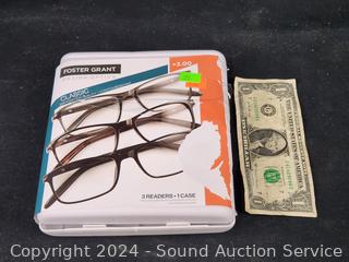Lot #0233: 3 Pairs Foster Grant Classic +3.0 Reading Glasses w/1 Case
