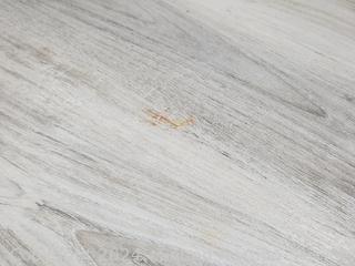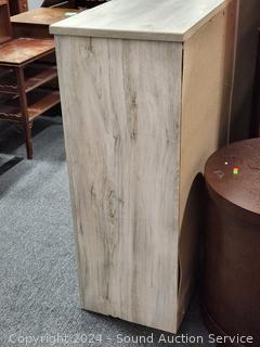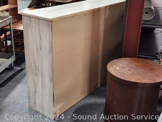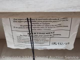 Particle board construction veneer finish, roller drawer guides. Small discolored spot on the top, don't see any other issues.
