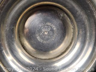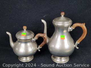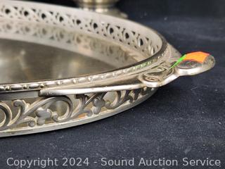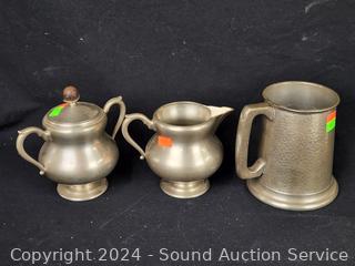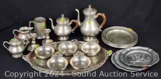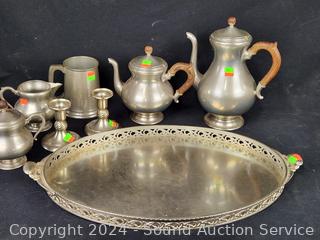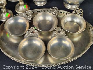 Tea, coffee pots, cream, sugar, bowls, plates, candleholders, tray.
