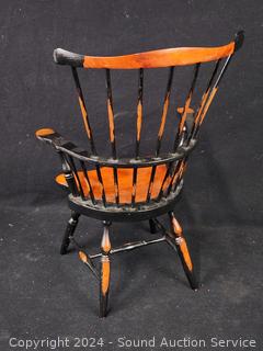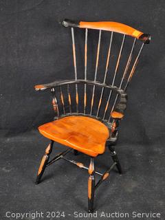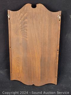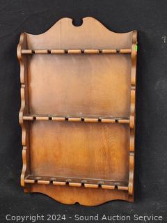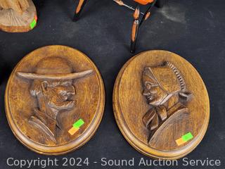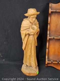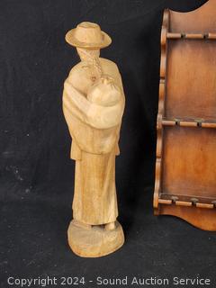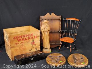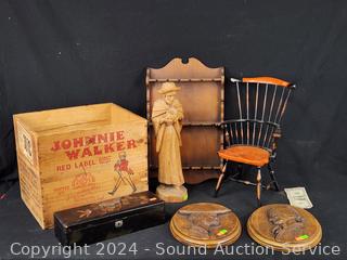 Johnnie Walker crate 11.5" x 10.5" x 13.5", collectors spoon rack, 2 hand carved Tom Cayley signed 1970 Ma & Pa plaques, 10" x 8", spindle back doll chair, hand craved wood figure, wood trinket box.
