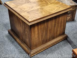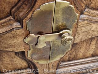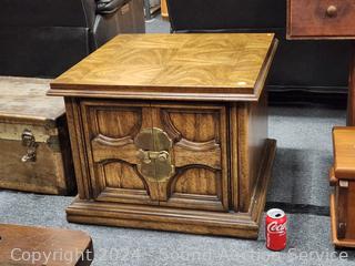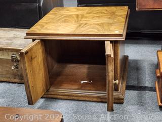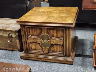 Lot #0028: Vtg. Oak Side Table Cabinet w/Brass Hardware