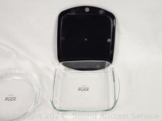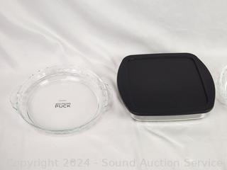 2 Pie Pans, 8" x 8" dish w/lid, 4 serving utensils, all with storage bags. Don't see any issues.