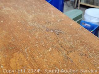 Solid wood construction. Various scuffs, wear to finish. 35" H x 38" W x 18" to seat.
