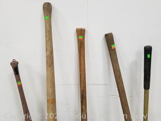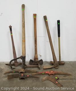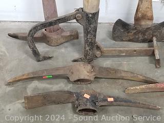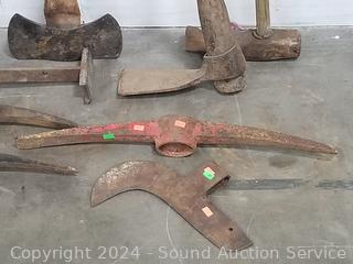 5 Pieces without handles. Double bit axe, peavey log turner, pickaxes, Adze brush hooks, etc. Refer to photos for more info.