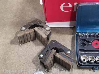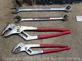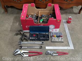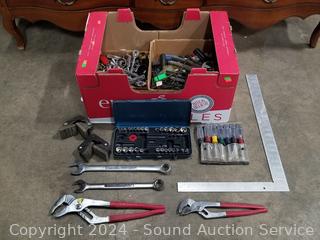 Pliers, wrenches, sockets, carpenters square & more. Refer to photos for more details.