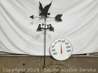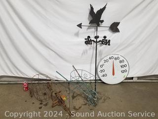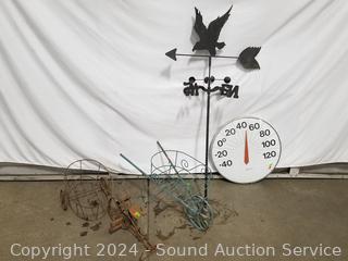 Airguide 18" thermometer. Weathervane 46" long, rustic bicycle & wheelbarrow decor.