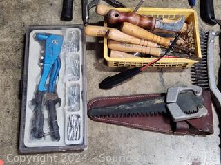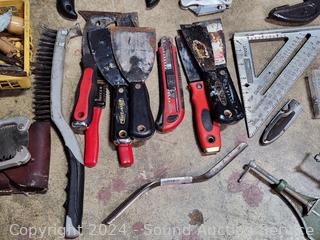 317 Lot including Brown Microfiber Vinyl Reclining Sofa's, King & Queen Beds, Woodchipper, Lawn Mower, Massage/Heat Power Recliner, Live Edge Shelf/Console, Hutch, Dining Table, Drexel Serpentine Dresser, Assorted Tools (Power Tools, Hand Tools, Bits, Hardware, etc), Tool Chest, TV's, Ornate Carved Camphor Wood Chest, Electronics, Pop-Up Canopy, Assorted Kitchen Cookware, Household Goods, Home Decor, Artwork, Rugs & More!!!