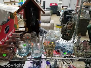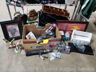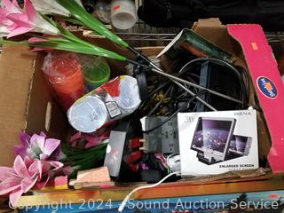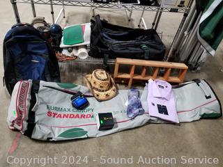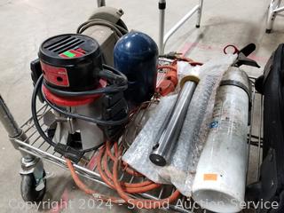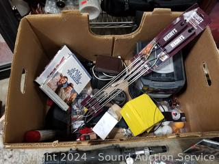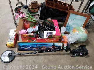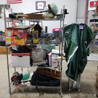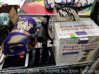 Pop-up canopy (damaged), battery charger, Philips DVD player, single burner propane stove, smore sticks, Propane lantern, mugs, Invicta watch case, painting, bags, router, bench grinder, globe, metal detector, smart watch, telescope & more. ATTN: Items may be missing pieces, damaged, not functioning, complete, no issues, etc. All items as is. Refer to photos for lot contents. Cart NOT included.
