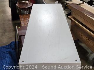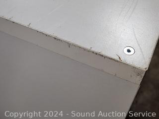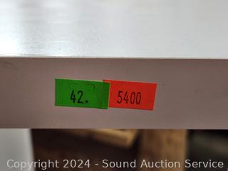 44" x 44" x 14.5". Some minor scuffs in laminate finish.