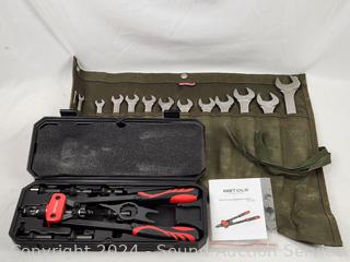 317 Lot including Brown Microfiber Vinyl Reclining Sofa's, King & Queen Beds, Woodchipper, Lawn Mower, Massage/Heat Power Recliner, Live Edge Shelf/Console, Hutch, Dining Table, Drexel Serpentine Dresser, Assorted Tools (Power Tools, Hand Tools, Bits, Hardware, etc), Tool Chest, TV's, Ornate Carved Camphor Wood Chest, Electronics, Pop-Up Canopy, Assorted Kitchen Cookware, Household Goods, Home Decor, Artwork, Rugs & More!!!