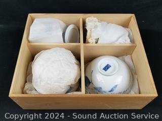 Comes with original wooden boxes. Each Set contains 2 cups, 2 bowls, 2 saucers. Model Y228W/8870. Unknown completeness.