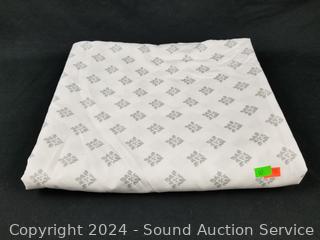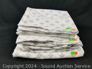 1 flat, 1 fitted, 4 pillowcases. White medallion print. Don't see any issues.