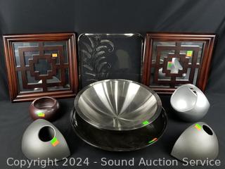 Lot #0133: 9pc Center Piece Bowls, Mirrored Wall Decor, Pottery Pots Decor
