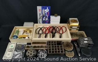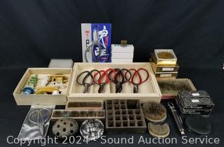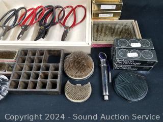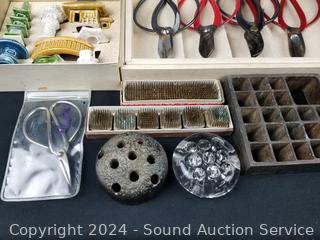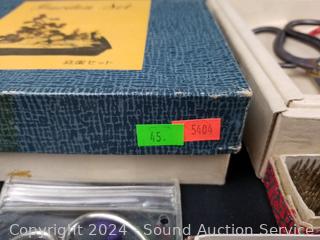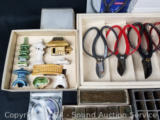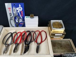 Porcelain garden pagoda decor (one piece is broken), 7 scissors/shears, box full of flower frogs. Refer to photos for more details.
