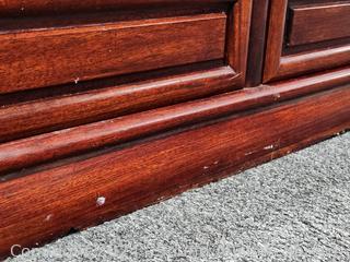 Sliding drop cabinets, tiered shelves, carved rails & support accents, solid wood construction, well made. Several drawers and cabinets, little notches on doors and drawers for a finger to open them, very hard find, and you are not able to open them unless you find them. Don't see any issues. 54.5" H x 52.5" W x 14" D.