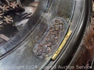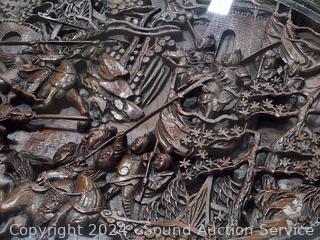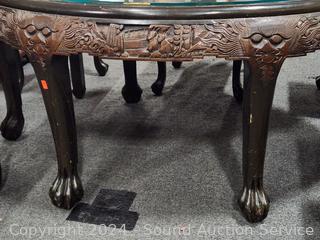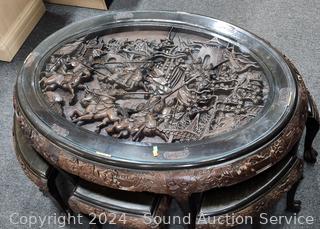 Image of a battle scene with glass top for viewing, claw feet. Almost every inch of the table & chairs are carved in fine detail. Absolutely stunning piece! I may need it! Do see some scratches on the top of chairs/stools & table edge. 21" H x 43" L x 31" W.