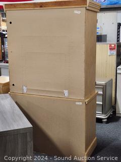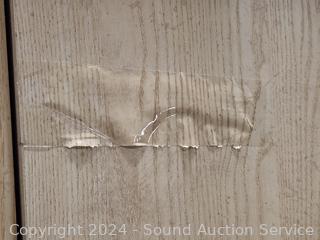 Particle board construction, wood grain finish. Scuff on right side & front edge, piece of tape (can't remove, peeling off finish), missing a pull. 82" H x 42" W x 21" D. Matches the next lot.