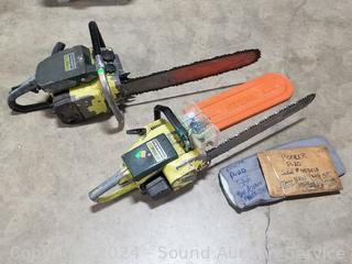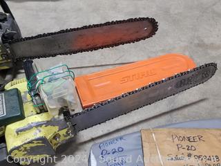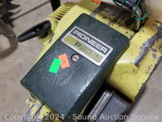 Pioneer P20 17" Chain Saw (starter rope not retracting properly), Pioneer P40 20" Chainsaw, has compression. No mix fuel to test properly. As is.
