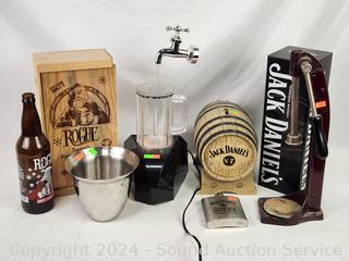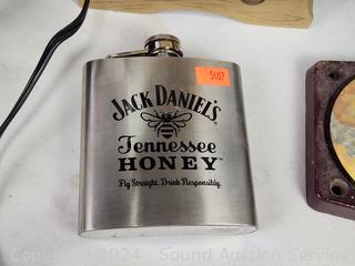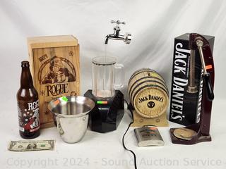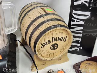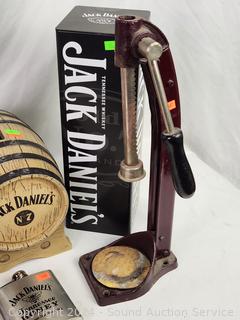 Jack Daniels Tin, George Dickel Ceramic Jug, Jack Daniels Keg Coin Bank, Bottle Capper, Flask, Wood Box & More.