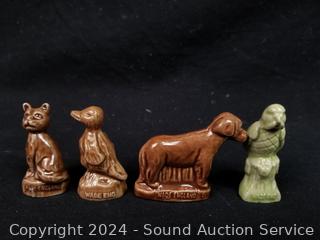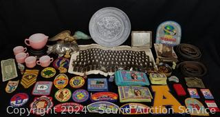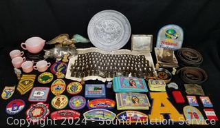 Porcelain Wade figures, various patches, paperweight, Anchor Hocking pink miniature teacups, saucers & creamer, leather belts, brass eagle, camel bucks & more.