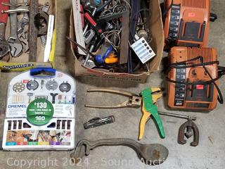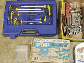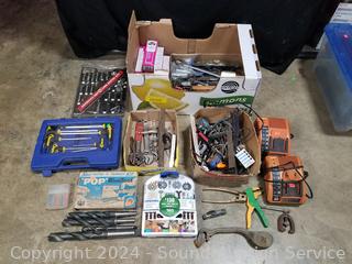Pop rivet tool, wrenches, hex key wrench set, large drill bits, Ridgid battery chargers, Tangit PVC sealant & more.