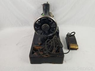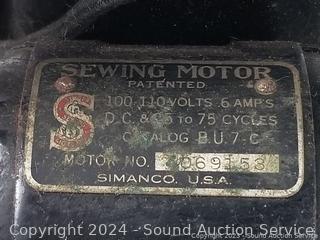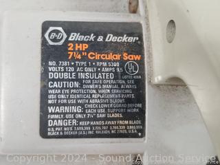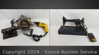 Black & Decker 7-1/4" Circular Saw & Sander, DeWalt VSR Drywall Screwdriver - Various wear from use. All appear to be functioning as intended. | Vintage 1930 Singer Elec. Sewing Machine w/Wood Case - Has power, non-functioning, pedal gets stuck in on/off positions, motor hums (not driving needle), lamp works, has a urine odor. Serial AD167593. As is.