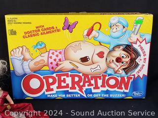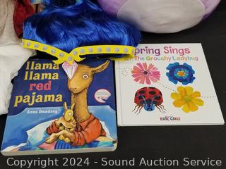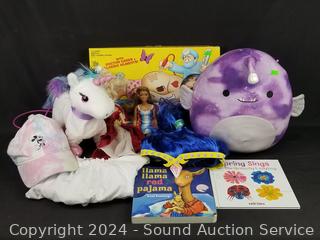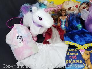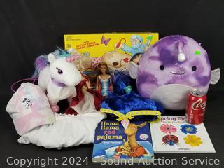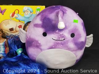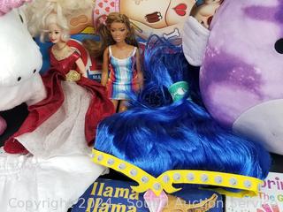 Lot #0144: Barbies, Squishmallow, Operation Game, Wig, Cap