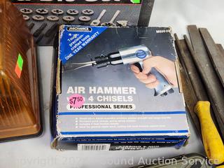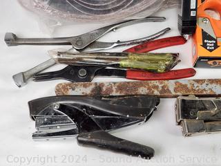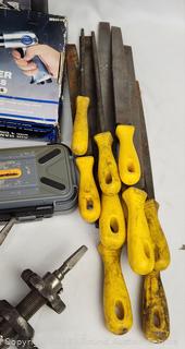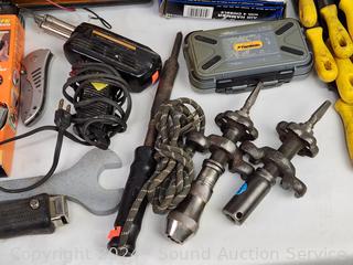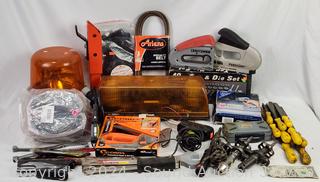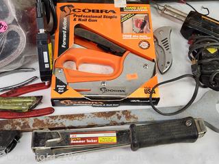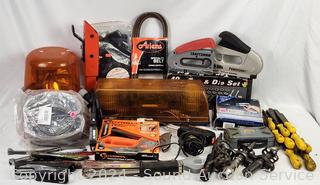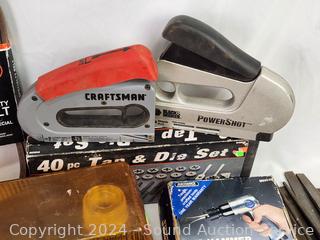 Cheetah & Austin Electrics Emergency Lights 5" x 17" x 6" & 9" H x 8" Dia (untested), staple guns, tap & die set, soldering gun (appears to be functioning as intended), files & more. Refer to photos for lot contents.