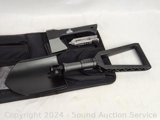Hatchet, shovel, light, hand saw, first aid kit, multi-tool. All appear unused.