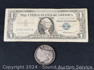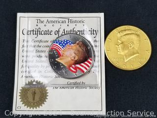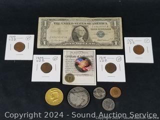 1888 Carson City Morgan dollar replica, (4) 1909 VDB Lincoln Cents, Golden 2013 Kennedy Half $1, Painted 2000 Kennedy Half $1 w/CoA, 1903 Indian Head Cent, 1907 Victory Nickel, Buffalo Nickel, 1957 $1 Silver Certificate. ATTN: We are not coin or currency experts or graders, please use your own judgement when bidding.