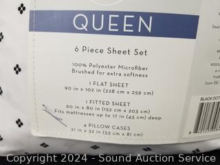 1 flat, 1 fitted, 2 pillowcases. Don't see any issues. Black dots print.