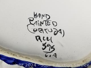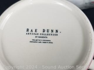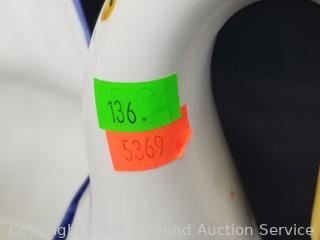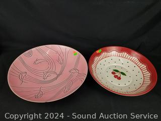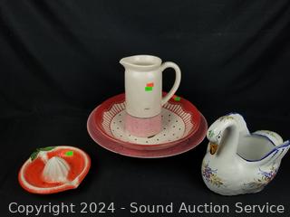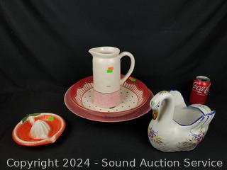 Pier-1 Italy Juicier, Hand Painted Goose bowl, Rae Dunn Pitcher, Mary Engelbreit 12" bowl, Roselane Pasadena Calif. 14" bowl (has a chip).