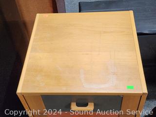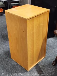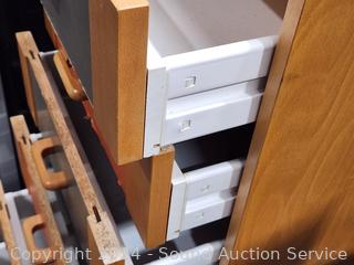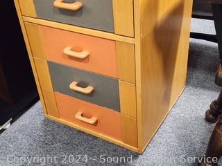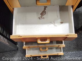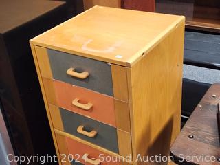 Some wear to the finish, some peeling, some staining/damage in drawers. 33.5" H x 17" W x 16-3/8" D.