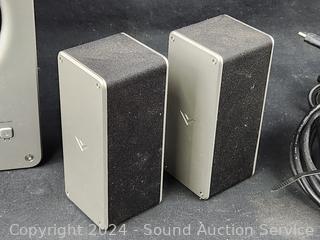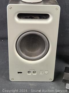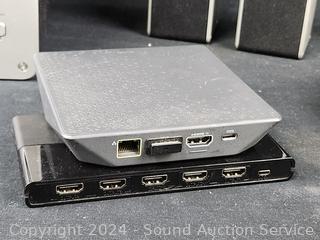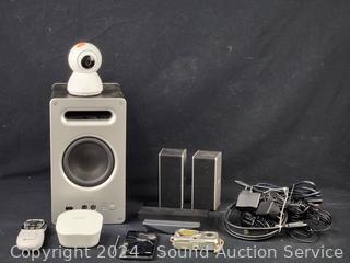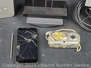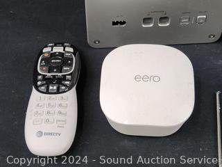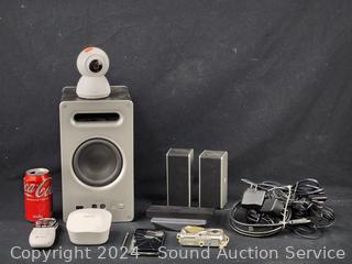 Vizio Subwoofer w/2 surround speakers (no soundbar to test), Victure camera, Eero router, Olympus 4MP Digital camera, Onn HDMI multiport switch, Direct TV Remote, damaged cellphone. Refer to photos for more info, as is.