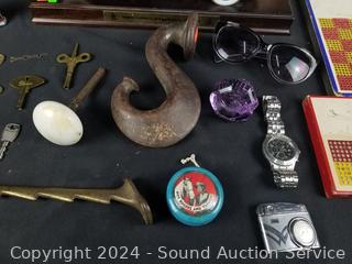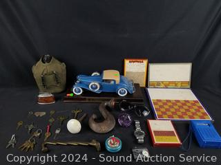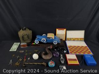 Danbury Mint 1925 Cord L-29 Special Coupe, Military Canteen, Punch Boards, Croton Chronograph Watch, YOYO, Table lighters, Purple Glass & Stone Doorknobs, AM/Radio. Refer to photos for more details.