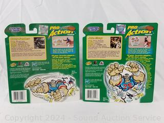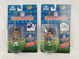 (2) 1999 Starting Lineup Pro Action Berry Bonds & John Elway, 1996 Corinthian Headliners Carter & Sanders Figures, 4 1998 Topps Action Flats. All sealed in original packaging.