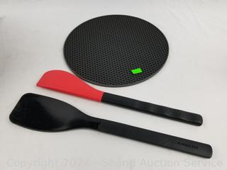 Has power, comes with 2 utensils, silicone trivet. Minor scuff on corner of the screen, utensils have some scuffs.