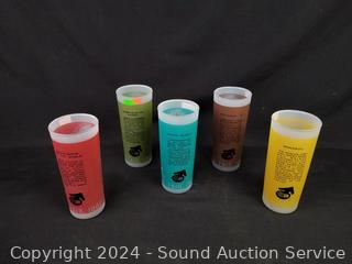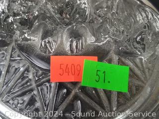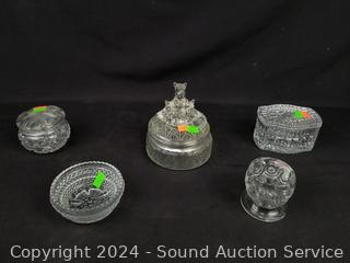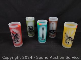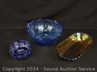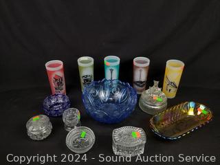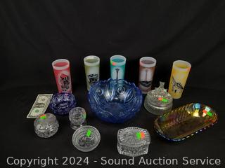 5 1962 Seattle Worlds Fair tumbler glasses, carnival glass dish, blue cut to clear crystal dish, blue console bowl, clear covered & open dishes.