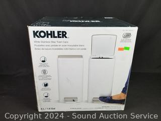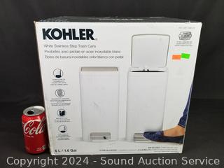 Lot #0174: 2pk Kohler 1.6 Gal. White Stainless Steel Step Trash Cans