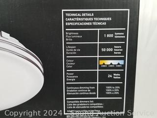 Appears to be functioning as intended, complete. 1,800LM, 24W, 3000k-5000K color. 13.03" x 2.24".
