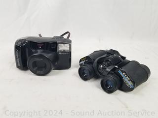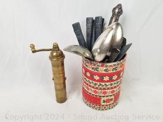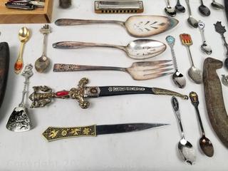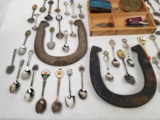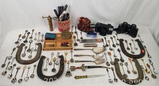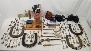 Horseshoes, carved burl vase, assorted collectors spoons, Fuji Discovery 2000 film camera, harmonica, Tasco Zip 8x30 binoculars, vintage brass Greek pepper mill, old brass lock, drawer organizer & more. Refer to photos for more details.