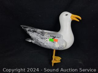 Parrot made from some sort of plaster or paper mâché type material, comes with handing bar it rests on, 17" long parrot. Believe seagull is made from wood, 10' H x 11" L.