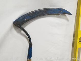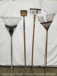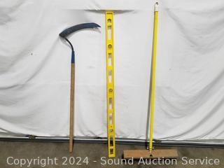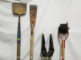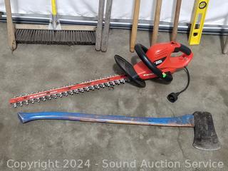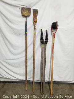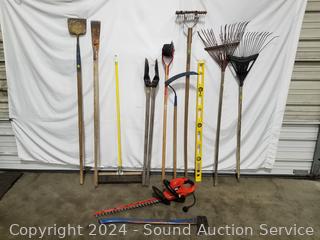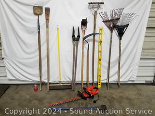 Posthole digger, Black & Decker 24" Hedge Hog elec. hedge trimmer (works), 4ft level, splitting axe, push broom, scythe, scrapper, leaf rakes, edger, scrapper. Signs of wear from use.