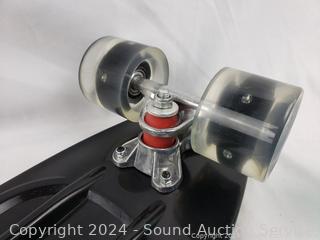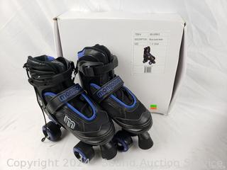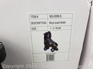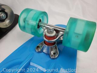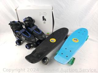 Lot #0140: 2 Blue/Black Shortboard Skateboards & Boys Roller Skates S:S,1-4
