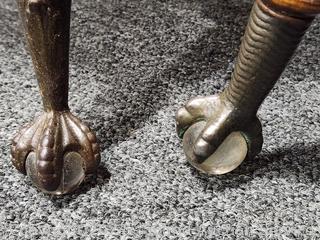 Glass balls, metal claws. Some minor scuffs in finish, solid wood construction. Approx. 18" to 23" H x 14" Dia.