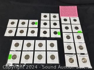 (10) 2004 Westward Journey Nickels. (6) 1963-1989 BU Jefferson Nickels, (14) 1940-1959 Jefferson Nickels. ATTN: We are not coin or currency experts or graders, please use your own judgement when bidding.