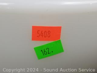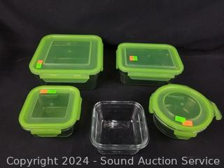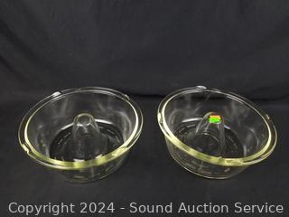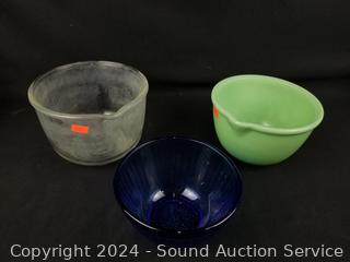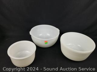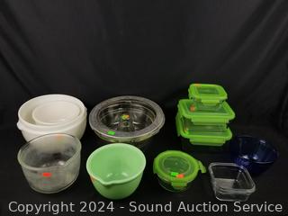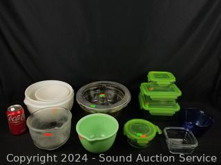 Glass Snapware storage containers, Jadeite bowl, Milk Glass bowls, class angel food cake pan.