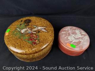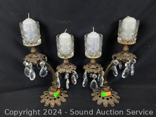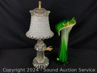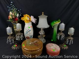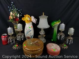 2 Candleholders/votives w/prisms, art glass vase, trinket boxes, boudoir lamp. Refer to photos for more details.