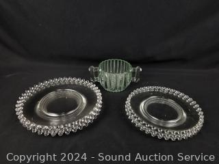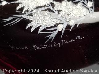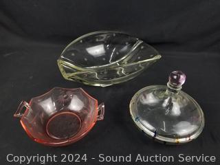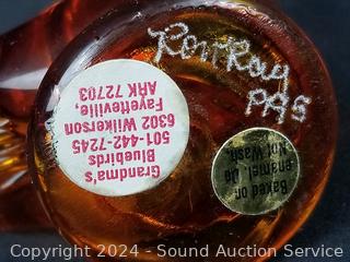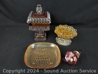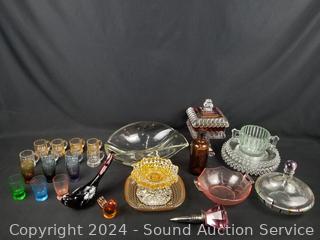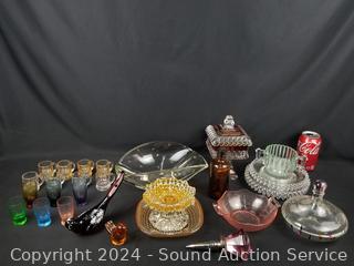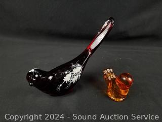 Ruby bird is hand painted, signed, possibly Fenton. Orange bird signed Conroy, shot glasses, Candlewick plates, ruby flash compote & more. Refer to photos for more details.