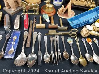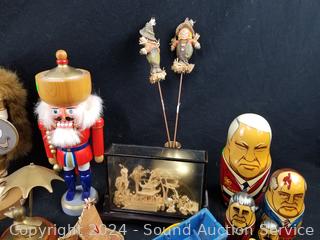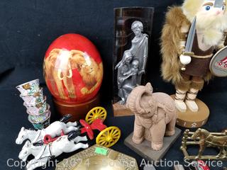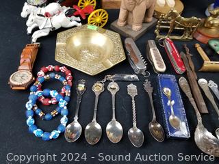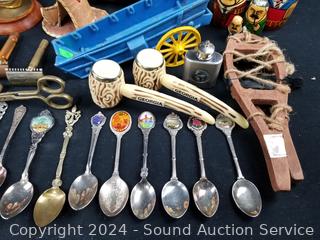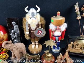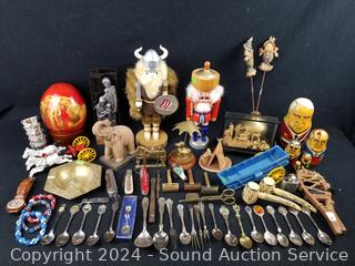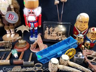 Cast iron horse & carriage, wood nutcrackers, Russian wood nesting dolls, pipe salt & pepper shakers, cork art, collectors spoons, Timex watch, miniature flask, vintage razors, snuff scissors, pocket knives & more.